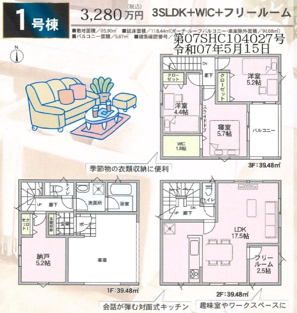 • (1号棟)3080万円/土地:65.90㎡/建物:118.44㎡